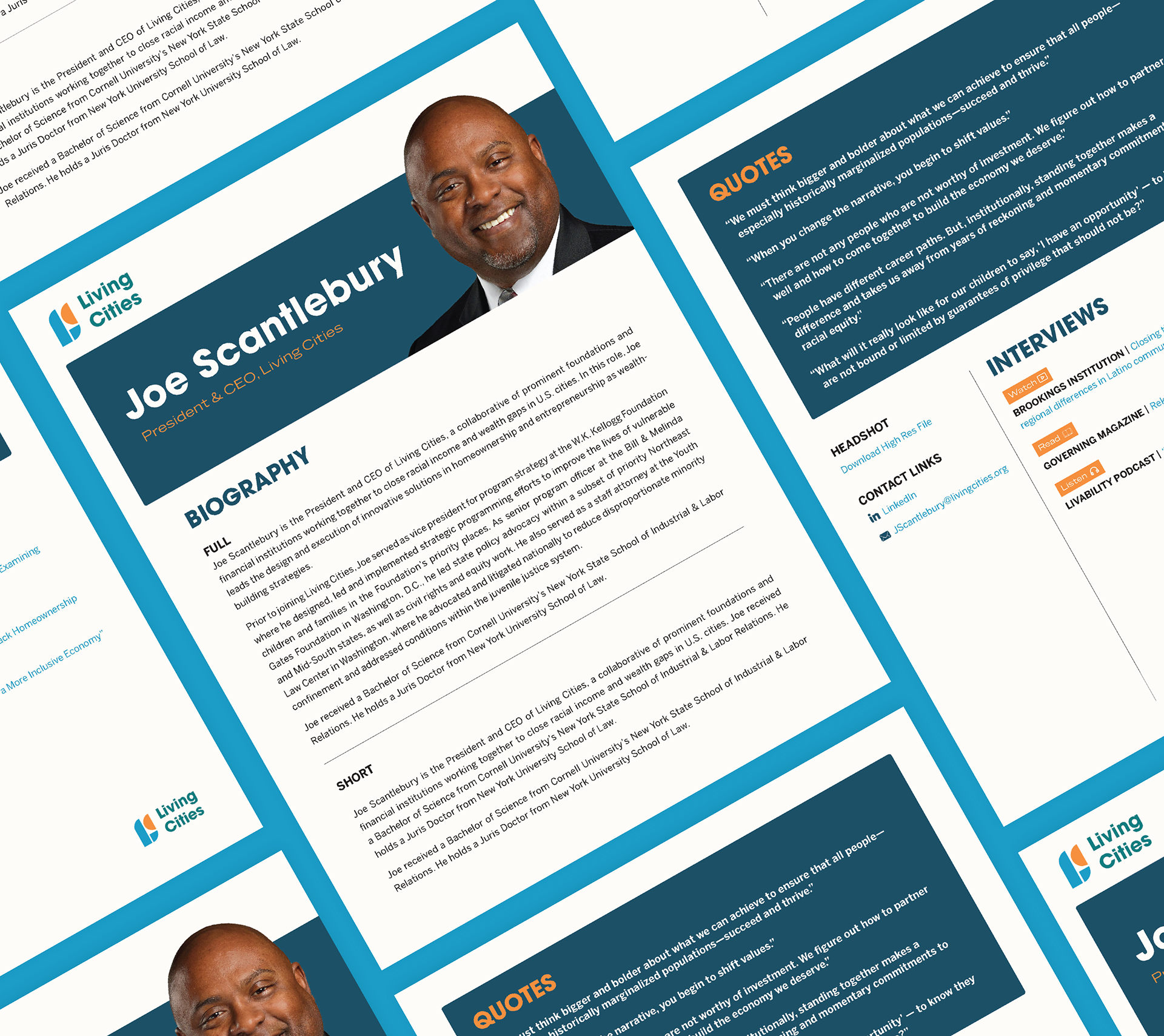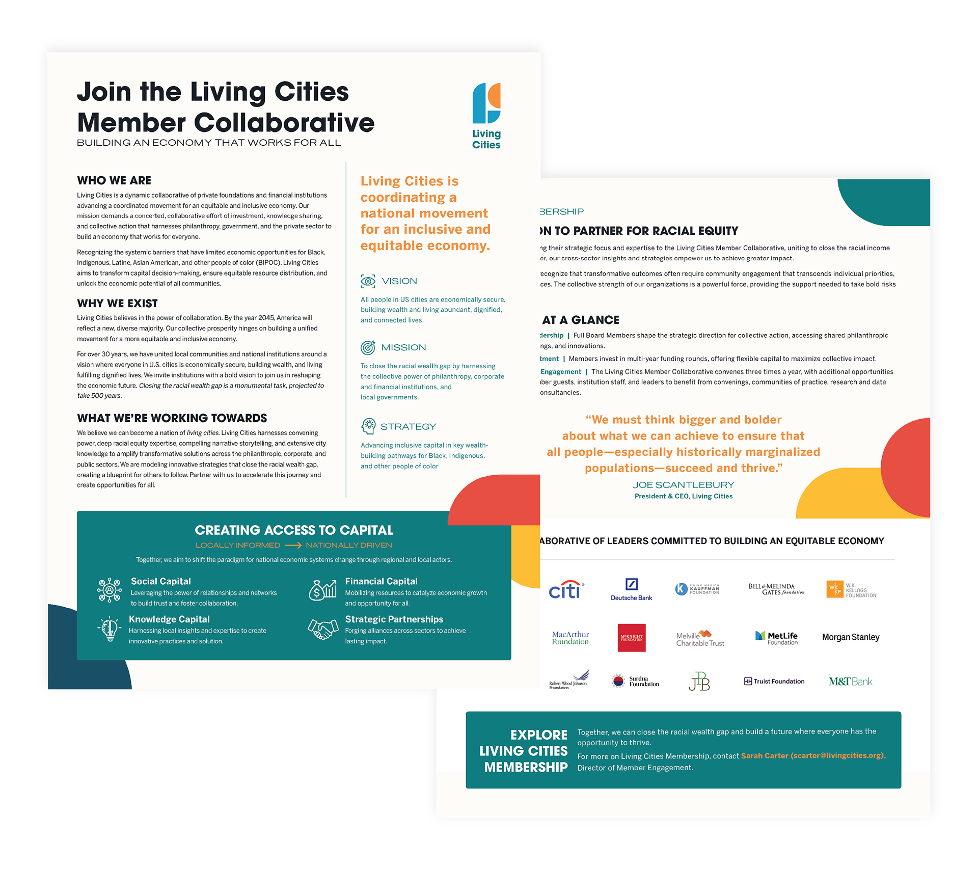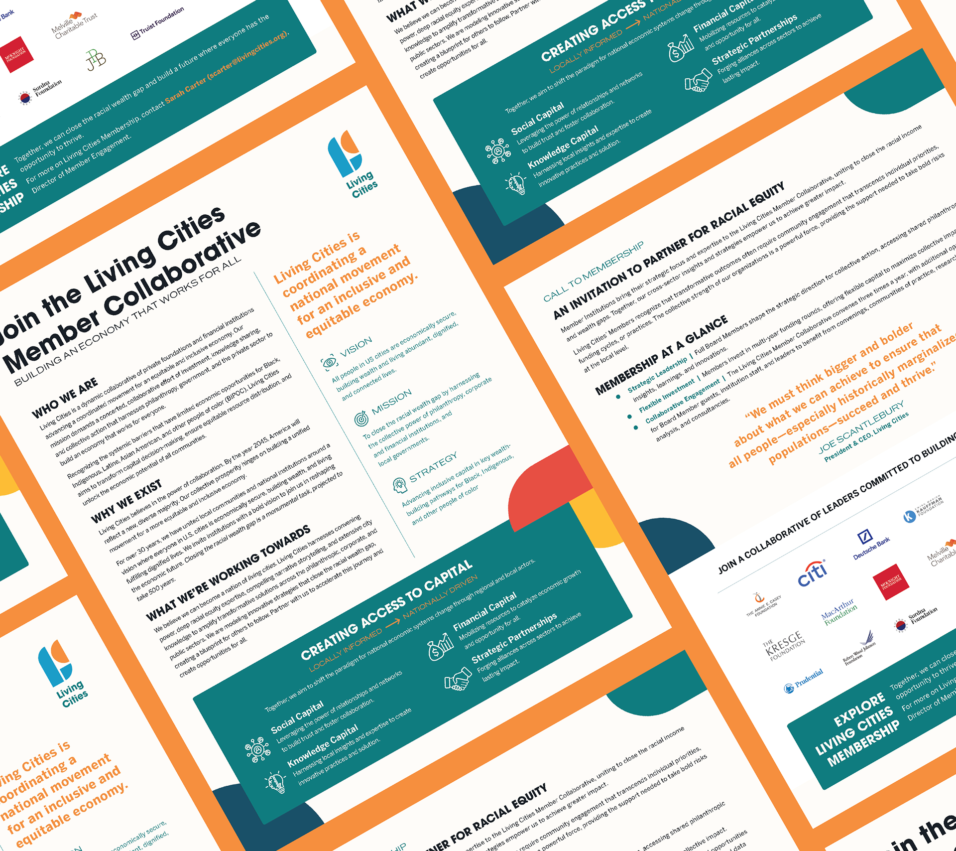 Living Cities required a cohesive suite of multi-channel communication assets to support both internal engagement and external growth initiatives. The work spanned a variety of formats, each designed to translate complex organizational priorities into clear, visually aligned materials.
